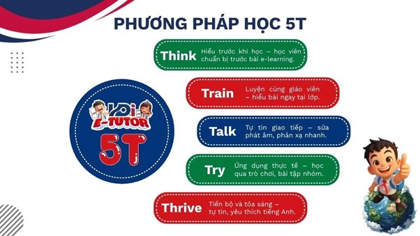 Mô hình này được thể hiện rõ nét qua việc áp dụng Phương pháp học 5T (Think - Train - Talk - Try - Thrive). Nền tảng lớp học từ ClassIn giúp trẻ Think (Tư duy) chuẩn bị trước bài học và cung cấp môi trường để Talk (Giao tiếp) và Try (Ứng dụng) hiệu quả. Tuy nhiên, chính sự dẫn dắt của giáo viên mới là yếu tố đảm bảo trẻ thực hiện đúng, giữ được sự yêu thích môn học và đạt được Thrive (Tiến bộ) bền vững.