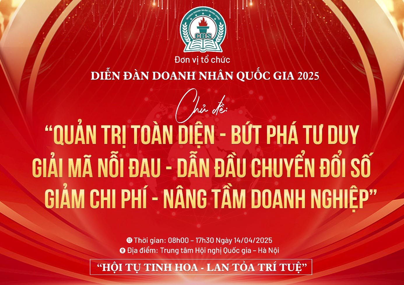 Sự kiện sẽ diễn ra vào ngày 14/10/2025 tại Trung tâm Hội nghị Quốc gia (Mỹ Đình, Hà Nội), quy tụ hơn 3.000 lãnh đạo doanh nghiệp, giám đốc điều hành (CEO) cùng đại diện của 50 hiệp hội và câu lạc bộ doanh nghiệp trên toàn quốc. Với chủ đề đầy khát vọng: “Quản trị toàn diện - Bứt phá tư duy - Giải mã nỗi đau - Dẫn đầu chuyển đổi số - Nâng tầm doanh nghiệp để tiến vào kỷ nguyên vươn mình thịnh vượng”, diễn đàn được xem như một hội nghị thượng đỉnh của cộng đồng doanh nhân Việt Nam trong kỷ nguyên mới.