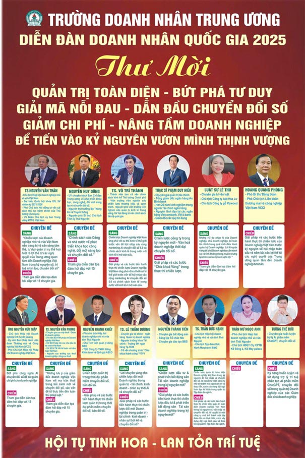 Trong nhịp chuyển động sôi sục của nền kinh tế toàn cầu, khi trí tuệ nhân tạo, chuyển đổi số và toàn cầu hóa đang làm thay đổi mọi chuẩn mực kinh doanh, doanh nhân Việt Nam lại một lần nữa đứng trước ngưỡng cửa của thử thách và cơ hội. Và giữa dòng chảy ấy, Diễn đàn Doanh nhân Quốc gia 2025, do Trường Doanh nhân Trung ương tổ chức, hứa hẹn trở thành điểm hẹn lớn nhất của giới doanh nhân Việt - nơi tri thức được hội tụ, tinh thần được đánh thức, và những tầm nhìn mới được mở ra.